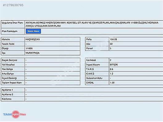 Участок находится в 150 метрах от Калеичи — исторического центра Антальи, что само по себе говорит о локации. Коэффициент плотности застройки 1.20 даёт реальный потенциал для девелопмента под жилую или коммерческую функцию. Рядовая застройка означает возможность работать в границах стандартного градостроительного регламента без дополнительных ограничений по фасаду. Звоните — расскажу подробнее и организую выезд на место.